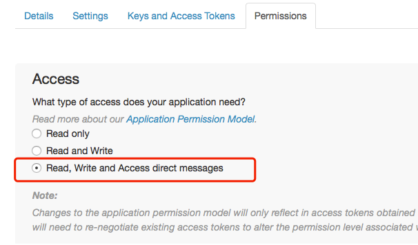 果不其然,在一个不起眼的角落里,发现了Twitter的权限分级选项,但只有3个:只读、写入和读写(如下图):