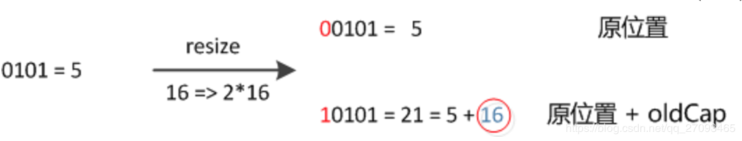 所以,原hash值新增参与运算的的那一bit如果是0,则在新数组中的下标不变,如果原hash值新增参与运算的那一bit是1,则在新数组中的下标为:原索引+原数组容量。