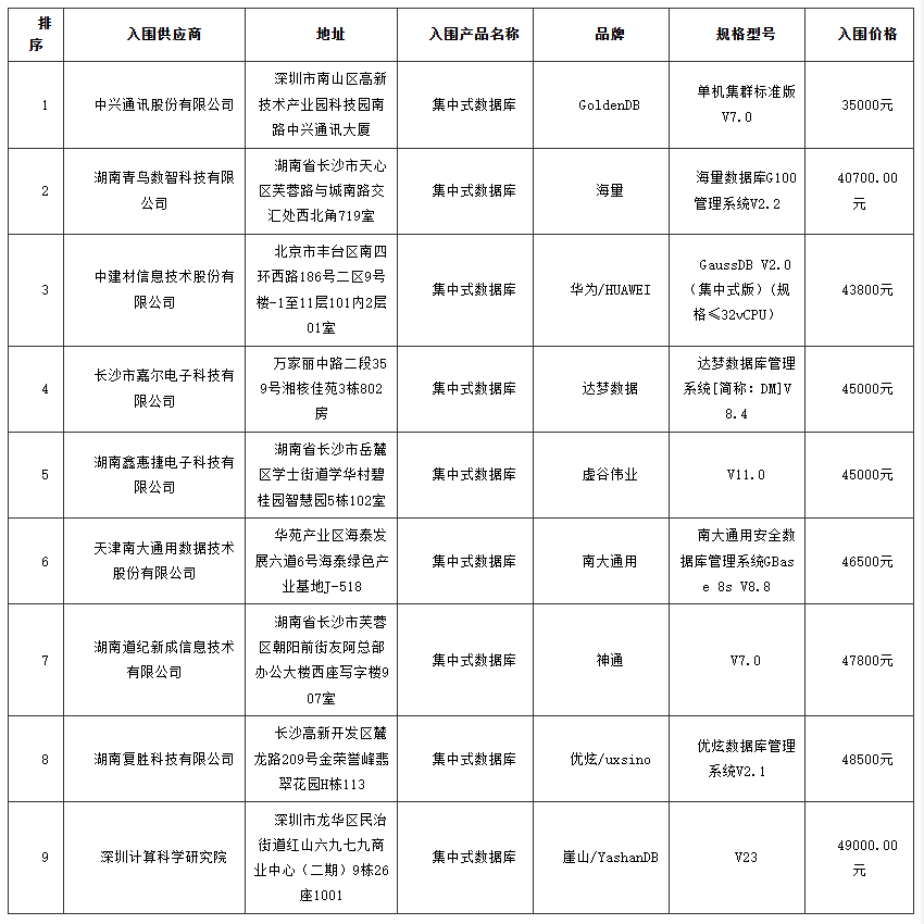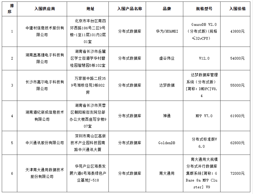 1月10日,湖南省公共资源交易中心公布了《湖南省各级预算单位2024年操作系统、数据库框架协议采购项目入围结果》,共有9家数据库产品入围,包括GoldenDB、华为GaussDB、海量、达梦、南大通用、虚谷、神通、优炫和YashanDB。此次采购分为集中式和分布式数据库两个分包,入围产品涵盖了国内外主流数据库品牌,最高入围价格分别为49000元(集中式)和72000元(分布式)。