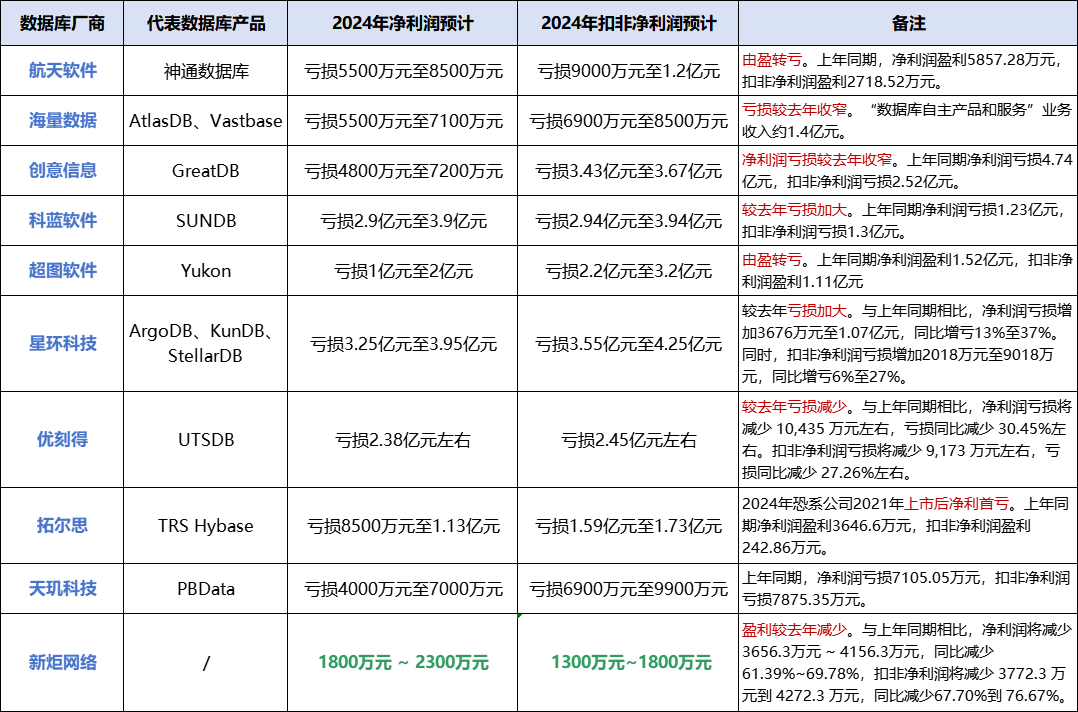 2025年1月,多家数据库相关公司陆续发布了2024年业绩预告。2024年,数据库相关厂商普遍面临财务挑战,业绩预告显示几乎全部厂商均预计亏损。其中,航天软件、海量数据、创意信息、科蓝软件、超图软件、星环科技、优刻得、拓尔思和天玑科技等均预计出现不同程度的亏损,主要原因包括宏观经济影响、市场竞争加剧、项目验收缓慢、研发投入增加等。尽管多数厂商亏损,但部分厂商如优刻得显示出亏损收窄的趋势,而新炬网络则成为唯一预计盈利的厂商,尽管其净利润也预计将同比减少。这些业绩预告反映了数据库行业在2024年在整体市场环境较差的情况下面临不小的经营挑战。