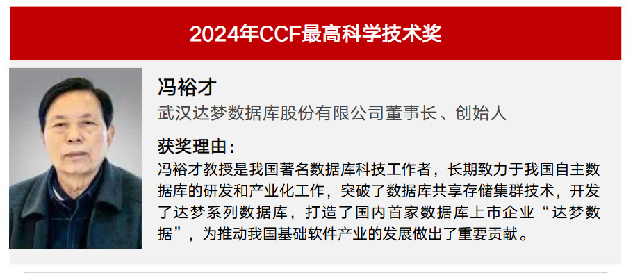 1月6日,达梦公司董事长、创始人冯裕才教授被CCF(中国计算机学会)授予2024年“CCF最高科学技术奖”,以表彰其为中国计算机事业的发展做出的卓越贡献。