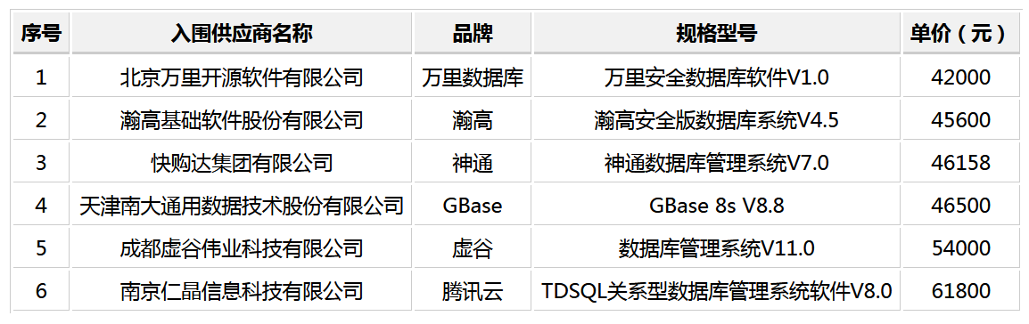 1月17日,江苏省政府采购中心发布《2025年度江苏省党政机关、事业单位及团体组织数据库管理系统框架协议采购入围公告》。项目预算为2000万元,共有六家公司中标。中标产品涵盖万里安全数据库GreatDB、瀚高安全版数据库HighGoDB、神通数据库、南大通用GBase 8s、虚谷数据库和腾讯云TDSQL,中标单价从42000元到61800元不等。