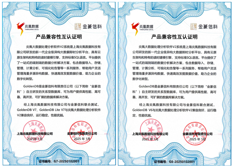 1月6日,炎凰数据与金篆信科完成兼容互认证。经测试,金篆信科GoldenDB V7、GoldenDB Lite V7、GoldenDB V6与炎凰大数据处理分析软件V2兼容良好,运行稳定,性能优越。
