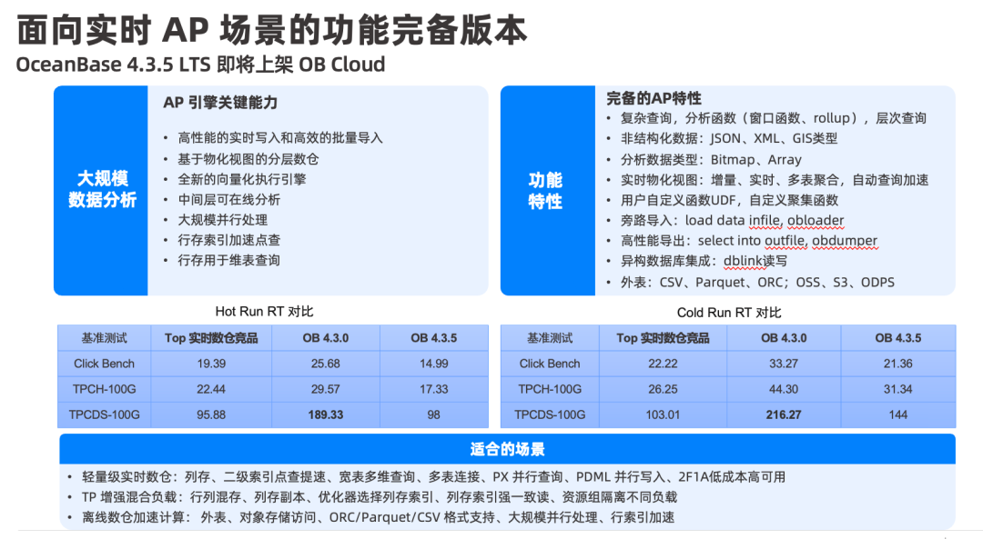 1月16日,OB Cloud在2025年首场线上见面会上宣布了两项重大发布:一是面向AP场景的OceanBase 4.3.5 LTS版本即将在一季度内上线OB Cloud,该版本在性能、功能、兼容性和易用性上进行了全面提升,特别是在向量索引和多模数据处理方面;二是云上高可用性能的升级,OB Cloud实现了跨云双活和主备能力,支持企业在不同云服务商之间进行数据同步和故障转移,以满足跨云容灾需求。
