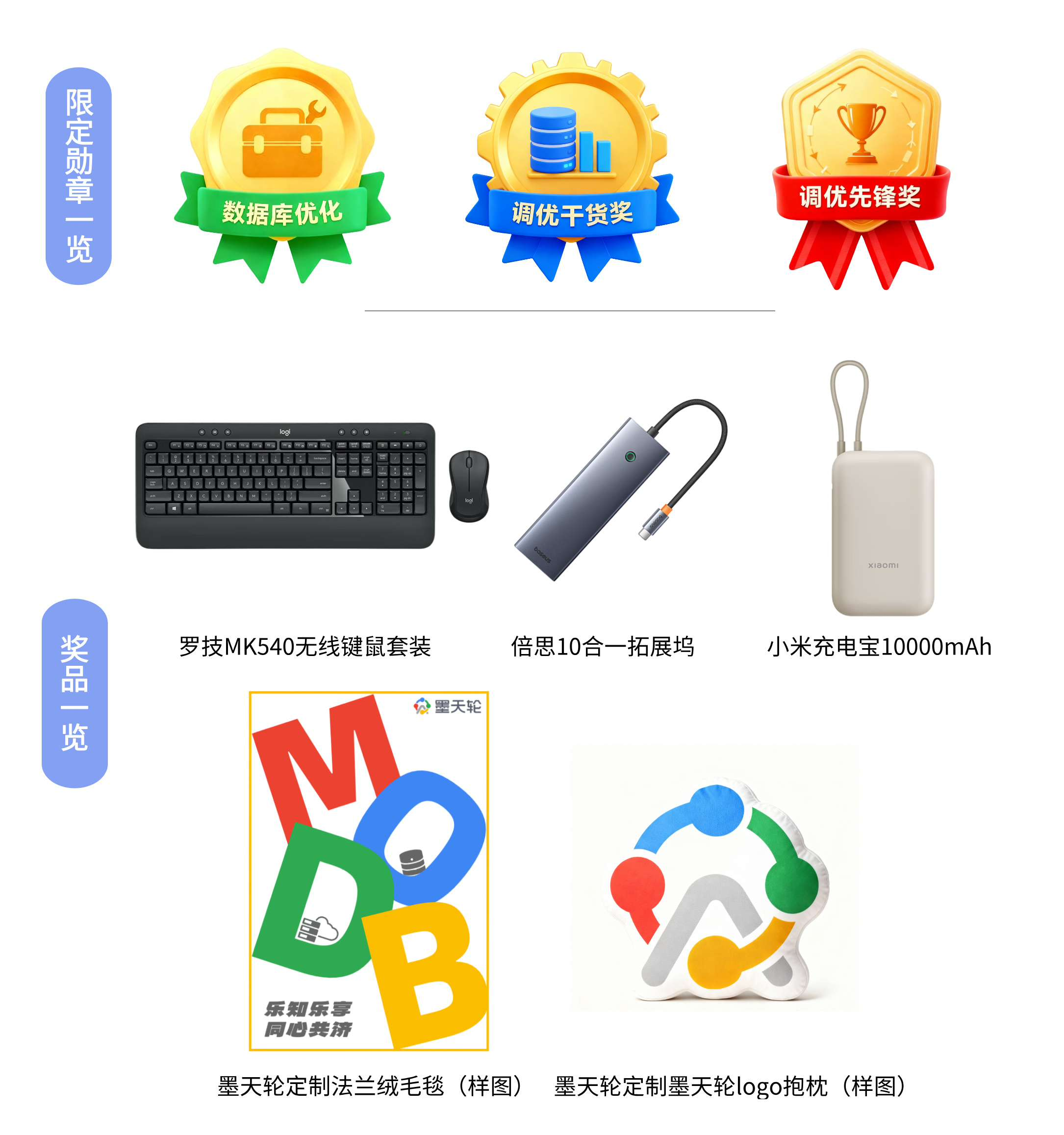 | 调优干货奖 | 若干篇 | 调优干货限定勋章(虚拟)+实物奖品(以下奖品可二选一):1、墨天轮定制法兰绒毛毯; 2、墨天轮定制墨天轮logo抱枕 |