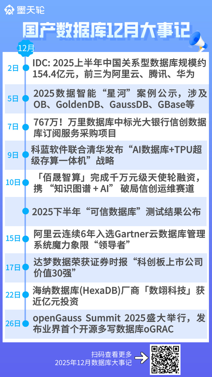 2025年12月国产数据库大事记:佰晟智算与数翊科技获千万级融资,下半年“可信数据库”结果公布,openGauss Summit 2025举办……