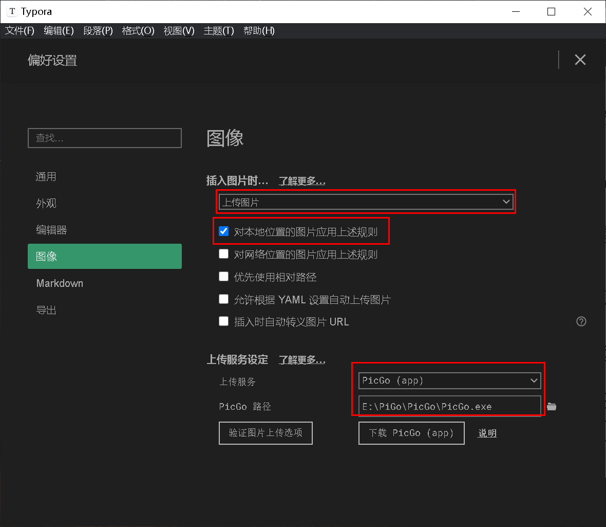 打开Typora,点击左上角文件,选择偏好设置,在图像这一栏,更改选项,把状态栏里的改为上传图片;勾选上“对本地位置的图片应用上述规则”;上传服务状态栏改为PicGo(app);PicGo路径改为你自己安装PicGo的.PicGo文件即可。