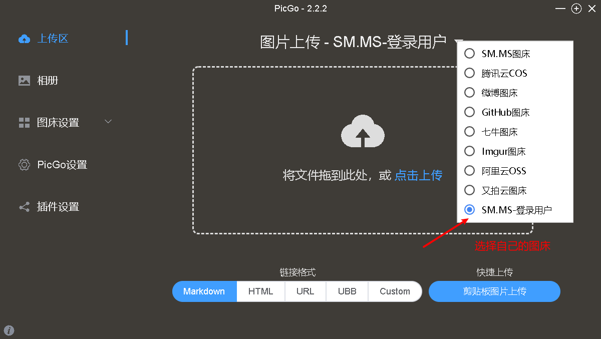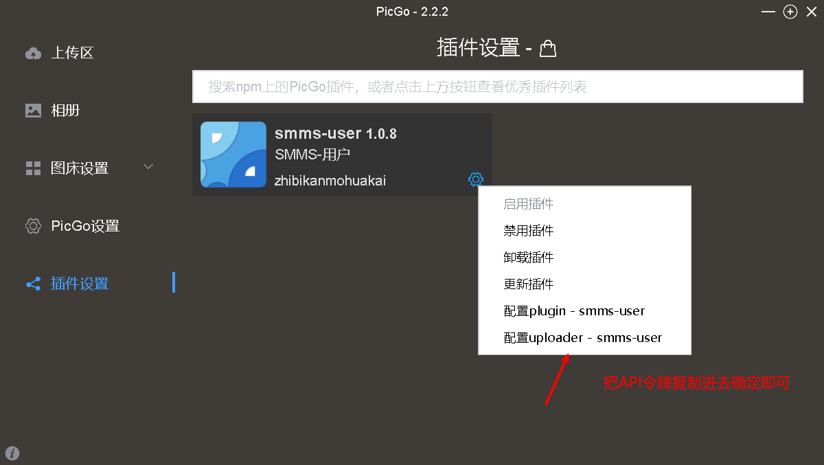 我用的是sm.ms的图床,其他还有很多图床,看自己的图床结合即可;先注册SM.MS账户;进入官网:https://sm.ms/,注册完后且登录上后,点击右上角的User选择Dashboard进入控制面板,点击API Token复制API令牌(或者点击下面的按钮换一个API令牌码);打开PicGo点击插件设置,点击插件右下角的设置按钮,选择配置uploader-smms-user,把刚刚复制的API令牌复制进去点击确定;然后把上传区改为SM.MS-登录用户就可以了.(因为内置的SM.MS已经无法使用了)