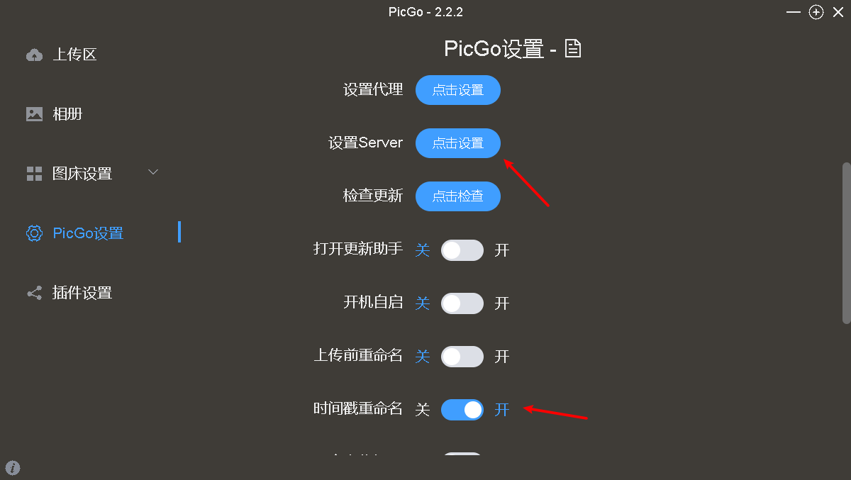 PicGo>PicGo设置>设置Server>时间戳重命名>插件设置>安装smms.user插件