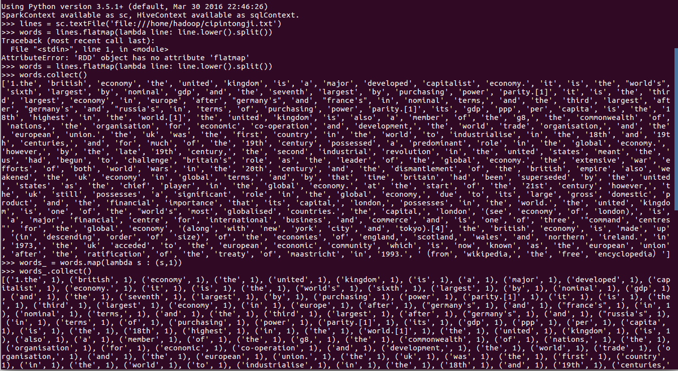 >>> lines = sc.textFile('file:///home/hadoop/cipintongji.txt')