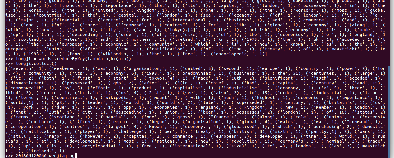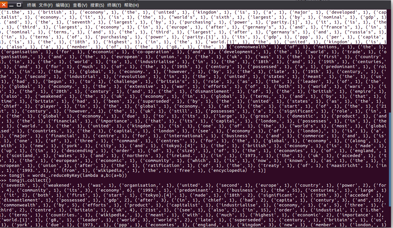 >>> tongji = words_.reduceByKey(lambda a,b:(a+b))