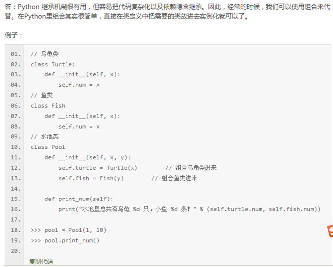 答: 关机实际应用场景确定 。 简单的说,组合用于 有一个 的场景中 ,继承用于 是一个的 场景中 。 例如,水池里有一个乌龟,天数有一个鸟 ,地上有个一个甲鱼 。这些适合使用组合 鲨鱼是鱼 ,西瓜是瓜 这些适合使用继承!