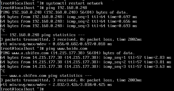 2、重启网卡,并测试网卡是否正常,由于需要安装后续软件,保证ping外网正常