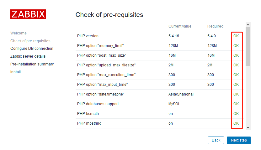 1、web打开192.168.0.236/zabbix,点击下一步,必须所有都是OK