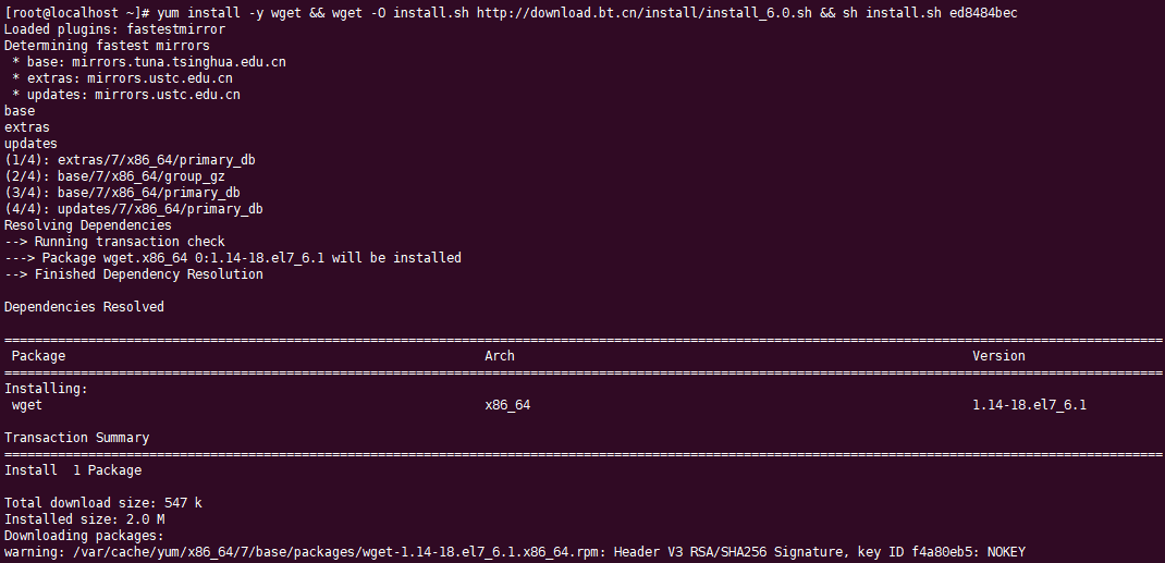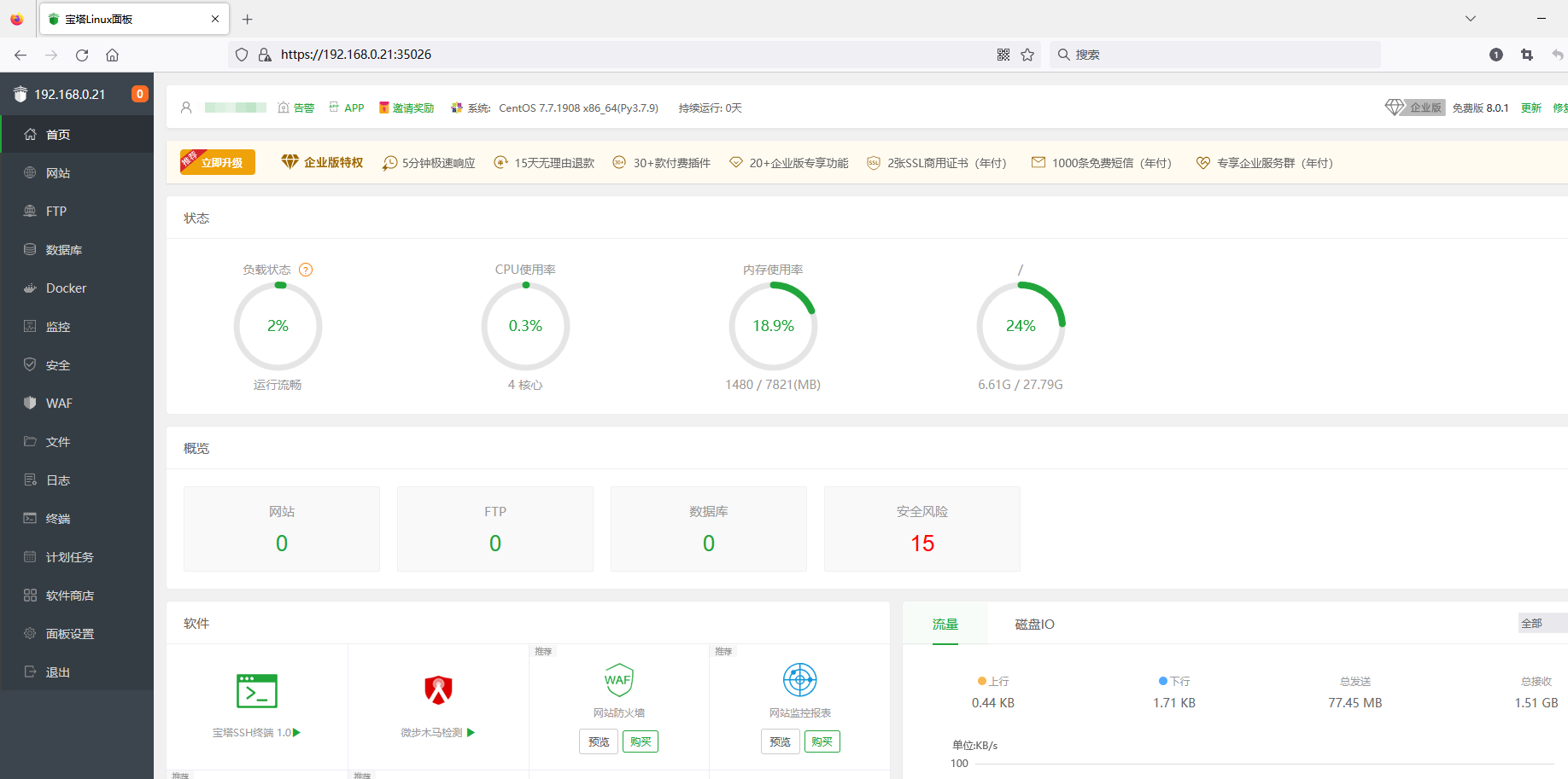 1、新安装的linux系统,输入yum install -y wget && wget -O install.sh http://download.bt.cn/install/install_6.0.sh && sh install.sh ed8484bec,直接安装宝塔