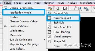 1、将已经布局布线的模块,创建一个Group,执行菜单命令Setup-Application Mode,进行模式的选取,在下拉菜单中选择Placement Edit布局模式,如图1所示;