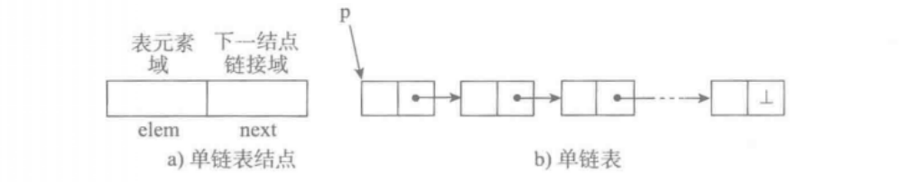 单向链接表,简称单链表或者链表,它的节点是一个二元组,形式如下图所示,其表元素域elem保存着作为表元素的数据项,链接域next里保存同一个表里的下一个节点的标识。