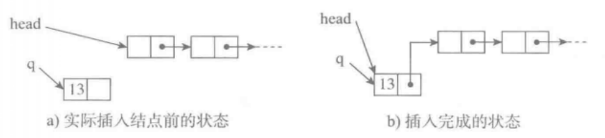 - 把原链接表首结点的链接存入新结点的链接域next,这一操作 将原表的一串结点链接在新结点之后
