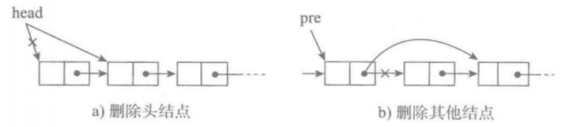 - 删除表首元素:删除表中第一个元素对应删除表的第一个结点,为此只需要修改表头指针,令其指向表中第二个结点。