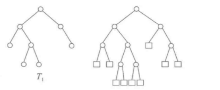 扩充二叉树:对二叉树T,加入足够多的新叶结点,使T的原有结点都边称度数为2的分支结点,得到的二叉树称为T的扩充二叉树,扩充二叉树中新增的结点称为外部结点,原树T的结点称为内部结点,空树的扩展二叉树规定为空树。如下图所示: