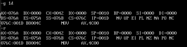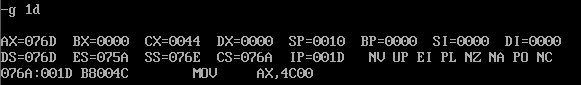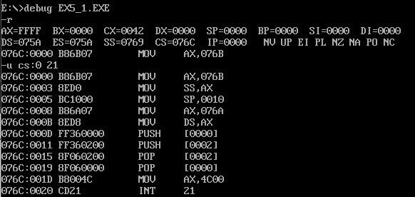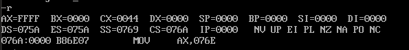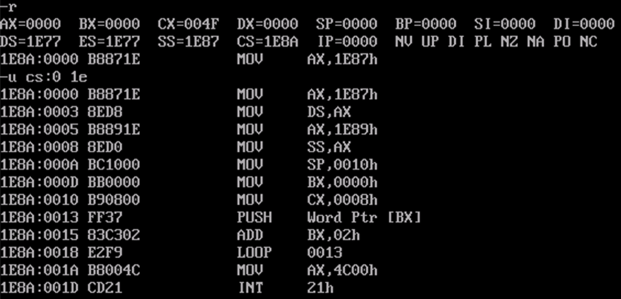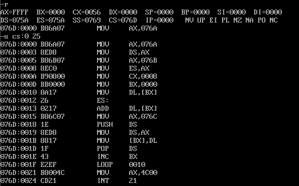 - 使用r命令查看cx的值,扣除数据段和栈段的 16 个字数据 (共占用 20 个字节) 可知代码段占用 22 个字节,对 cs:ip之后的22个字节反汇编得到: