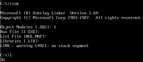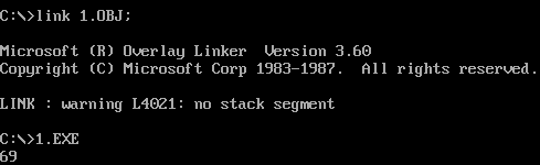 运行masm,进行编译,运行link,进行连接,执行1,得到结果。