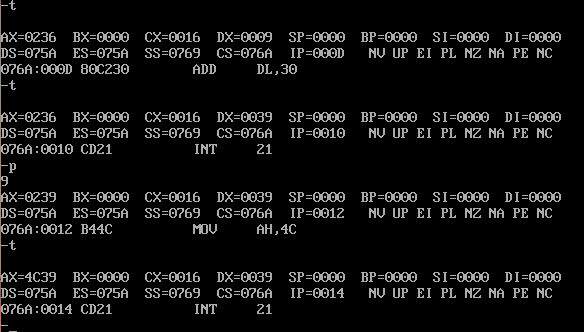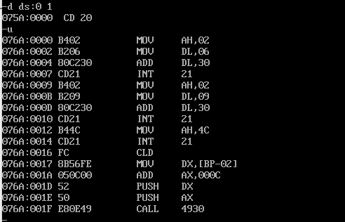 - 使用d ds:0 1查看PSP头两个字节,使用u观察反汇编得到的源代码。