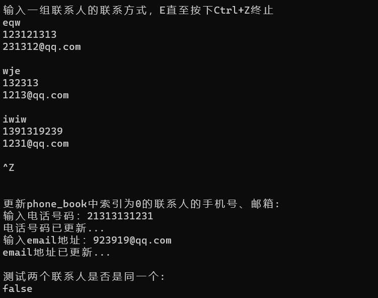 cout << "\n更新phone_book中索引为0的联系人的手机号、邮箱:\n";