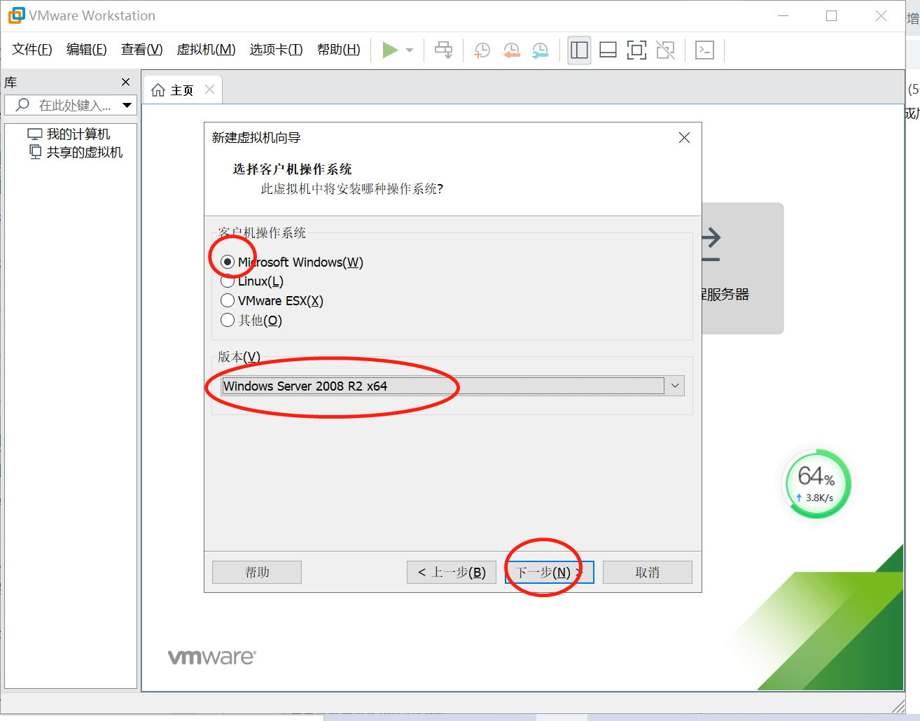 4.选择客户机操作系统以及版本,由于我们要安装Windows系列,所以选择如下图所示的两项,完成后单击下一步;