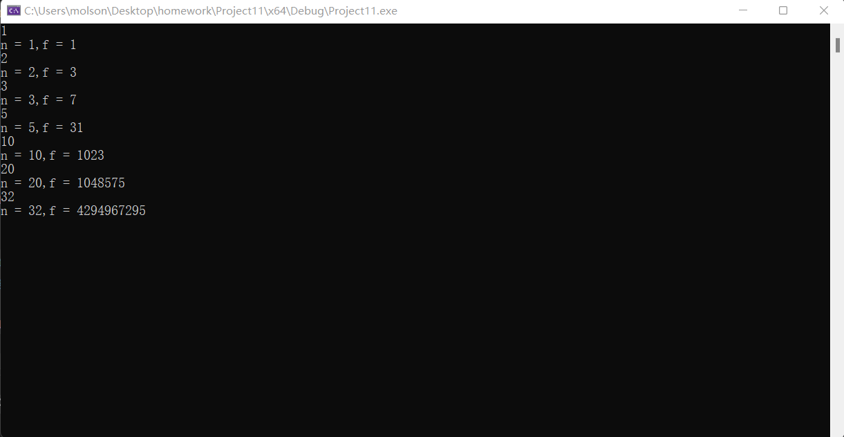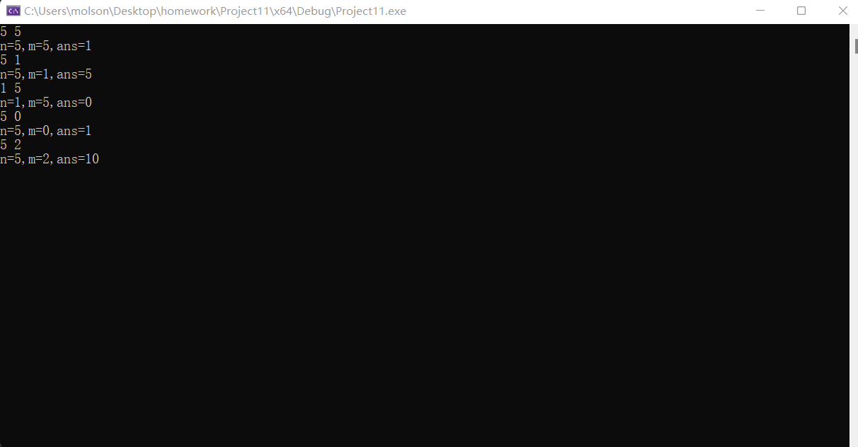 printf("n=%d,m=%d,ans=%d\n", n, m, func(n, m));
