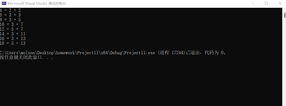 if (is_prime(n1) && is_prime(n2)) { printf("%d = %d + %d\n", oushu, n1, n2); break; }