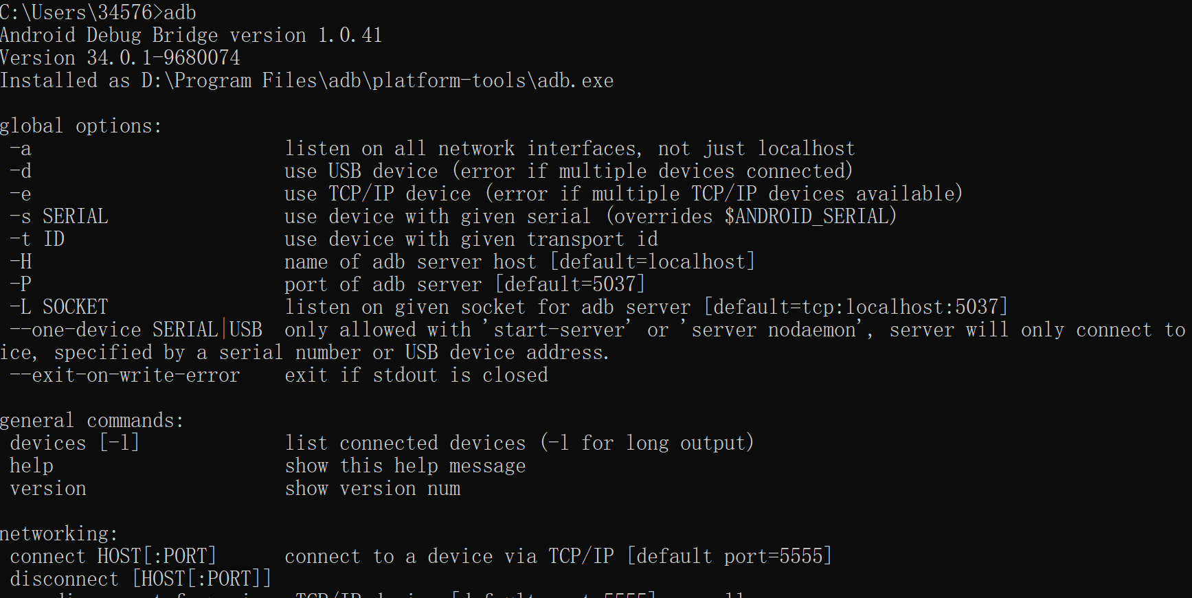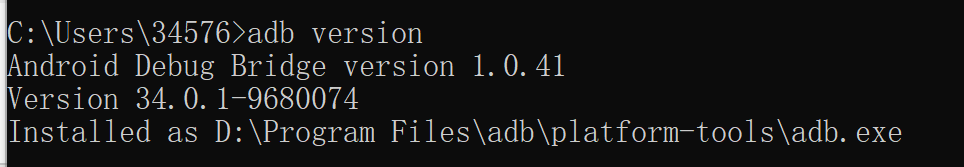 win+r健,输入cmd,弹出cmd的画面,输入adb version,显示以下信息,说明已安装成功。