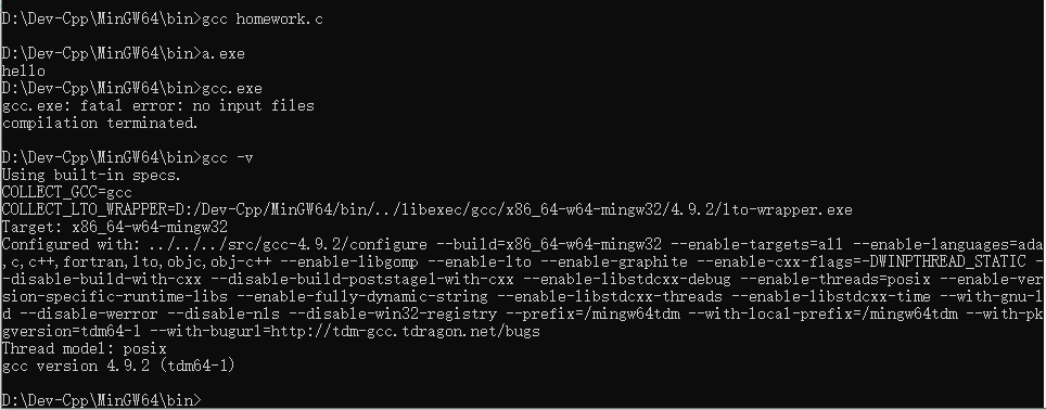 如上文,在查看完c++编译器版本后,输入源文件名再输入a.exe即可编译并运行,即可运行出结果(我的程序是一个很简单的输出hello的程序)