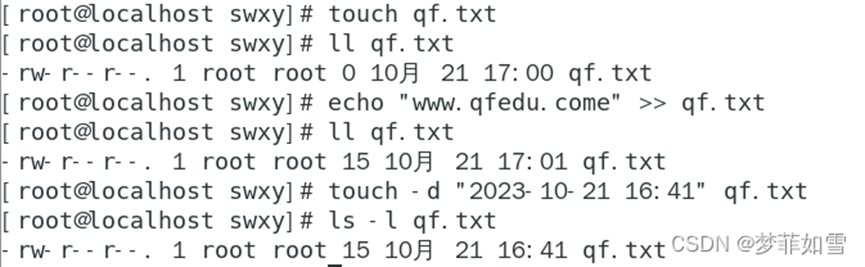 用户通过touch命令可创建一个空白文件,也可设置文件,属性,用echo命令可写入新内容,添加“-d”参数可修改文件时间,具体如下。