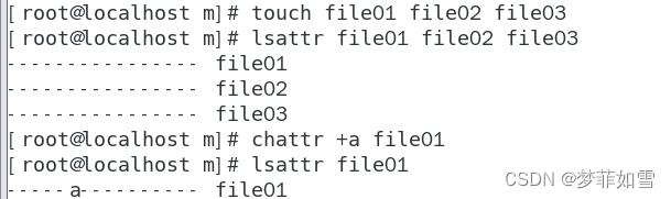创建三个文件,使用lsattr命令查看这3个文件的隐藏属性,全部为空,使用chattr命令给file01文件增加“a”属性,具体如下。