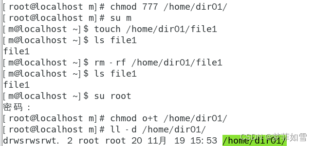 在目录/home下创建dir01,并赋予其777权限,使用m用户在该目录下创建文件file1,再使用tom用户尝试删除file1文件,添加“t”参数后,用户只能删除自己的文件,具体如下。