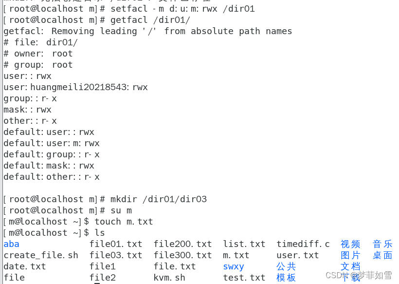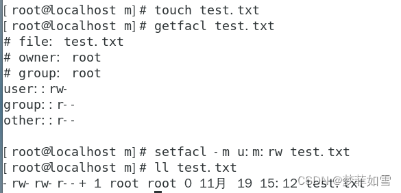 创建一个文件,使用getfacl命令查看ACL权限,setfacl命令可设置ACL权限,对每一个文件或目录进行更精确的权限设置,添加“-m”参数可以修改当前文件ACL权限。修改用户m下的text.txt文件的读,写权限,当用ll查看文件时,权限字符位最后出现“+”,说明该文件含有ACL权限,具体如下。