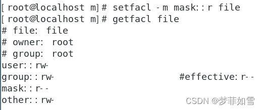 mask能临时降低用户或组(除owner和other)的权限,而不是如“setfacl -b”命令删除所有权限。
