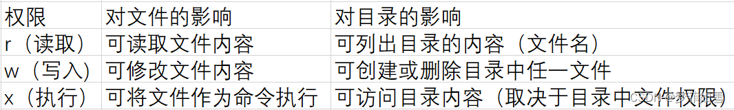 使用ll命令查看文件属性,第1行的第2-10个字符每3个字符为一组,左边3个字符表示属主的权限,中间3个字符表示属组的权限,右边3个字符是其他用户的权限。每组的3个字符的具体含义如下。