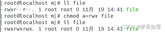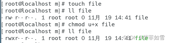 符号修改权限是使用u,o,g这3个符号代表属主,属组,其他用户这3种身份,a代表全部身份,r,w,x符号代表读,写,执行,通过赋值符增加,删除,覆盖文件权限。例如,创建文件file,给该文件的属组增加执行权限,具体如下。
