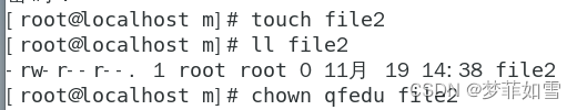 例如,创建文件file2,查看文件当前属主,使用chown命令修改文件的属主,将文件属主root改为qfedu,具体如下。