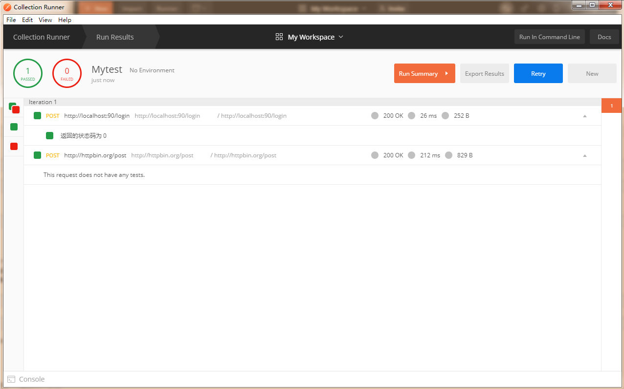 这个时候有的小伙伴肯定会很纳闷,我明明是运行了两条用例,为什么就只显示成功运行一条呢?这就是我们工作的过程当中可能会遇到的一些问题,我来告诉大家这是因为什么原因,其实是因为一个小细节,就是我在第一个接口当中加了断言,而第二个接口我忘记了添加所以造成了接口运行过后不知道以什么为依据来判断到底是成功还是失败,所以小伙伴们一定要记得,如果我们把测试用例放到测试集当中时不要忘了结合我们的测试用例以及接口文档来对我们的接口做一个断言。