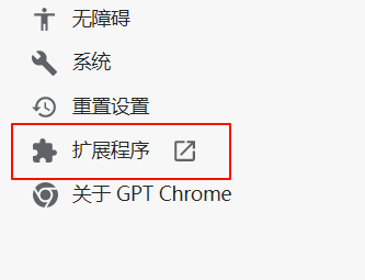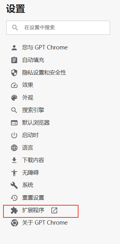 1.打开浏览器的设置,在设置里面点击扩展程序: