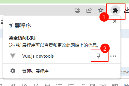 5.将vue插件固定到浏览器右上角,点击扩展程序,再点击固定: