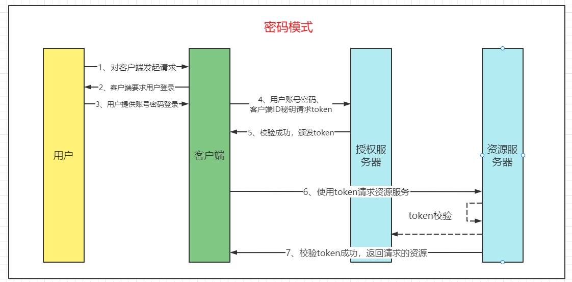 密码模式中需要用户提供自己的账号密码给客户端,客户端使用用户的账号密码和client_id client_secret去授权服务器请求token