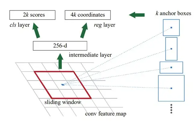 这里有个疑问,卷积核大小只是 3 x 3,对应的原图区域也就 48 x 48,但卷积结果却可以用来判断比这个区域大,甚至大很多的 anchor box,是否是前景物体,以及要修正的位置,听起来很奇怪,但作者却强调是可行的,打个比方,当我们在某个区域看到一个人脸图片,我们就可以判断出完整的人的图片的大小是多少,以及如何移动缩放这个区域使得它包含完整的人的图片,哪怕判断出的完整图片不对,比如这个人的下半身被其他东西遮住了看不到,但这没关系,这样这个推荐框在后面进一步分类时得分偏低,会被非极大抑制算法剔除,所以说这也有道理,这个能力可能确实是可以学习到的,但外面最大的框,和卷积核处理的区域大小差这么大,居然也能处理,感觉还是有点怪