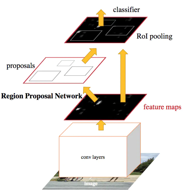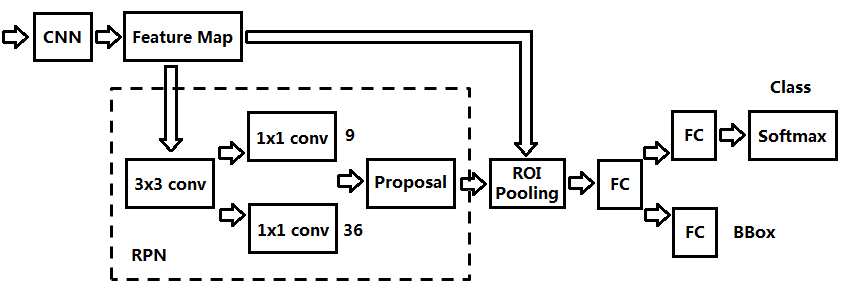 然后就和 Fast RCNN 一样了,将要检测的区域映射到特征图相应的位置,取出区域特征后,再做 ROI 池化确保大小固定,再全连接,再分别送入分类器和位置精修器,得到检测结果,再用非极大抑制算法剔除重复区域,得到最终结果