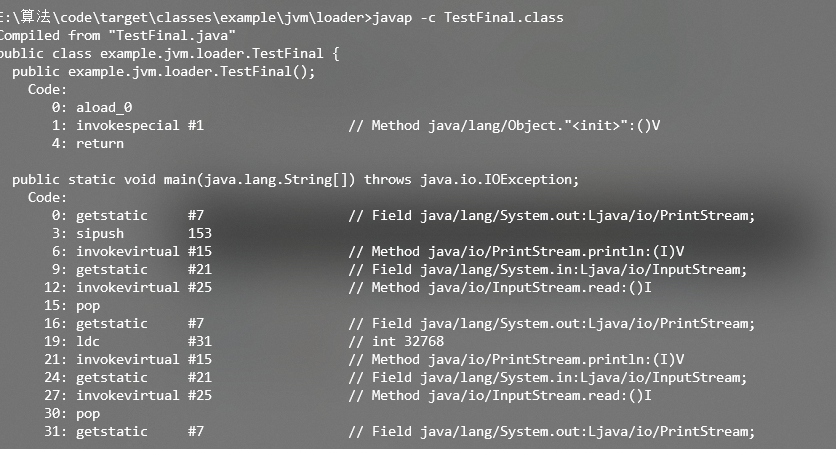 package example.jvm.loader; import java.io.IOException; import example.jvm.loader.Student; public class TestFinal { public static void main(String[] args) throws IOException { System.out.println(Student.c); // c 是 final static 基本类型 System.in.read(); System.out.println(Student.m); // m 是 final static 基本类型 System.in.read(); System.out.println(Student.n); // n 是 final static 引用类型 System.in.read(); } }