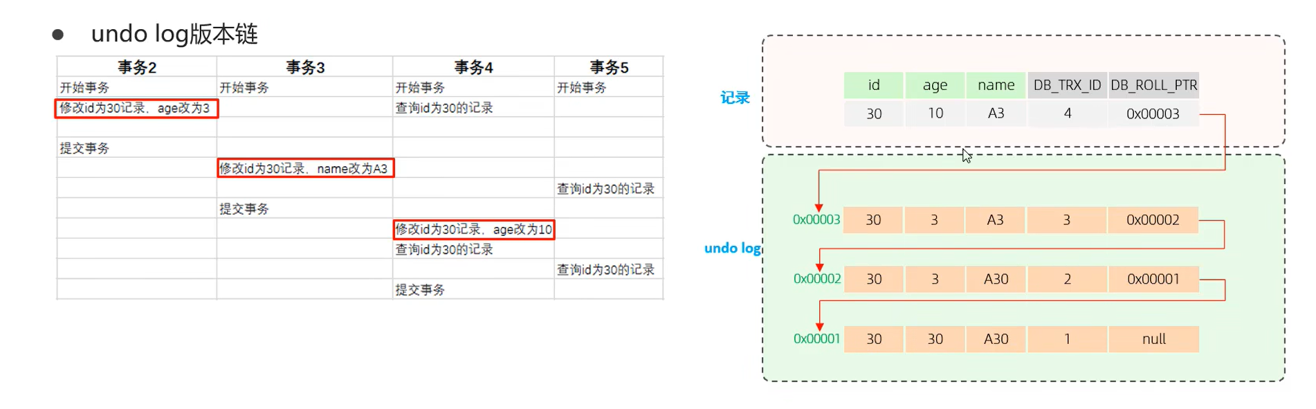 不同事务或者相同事务对同一条记录进行修改,会导致该记录的undolog生成一条记录版本链表,链表尾部是最早的旧记录。