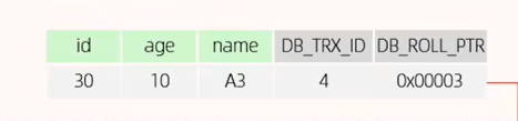 - DB_ROLL_PTR:回滚指针,指向这一条记录的上一个版本,配合undo log,指向上一个版本